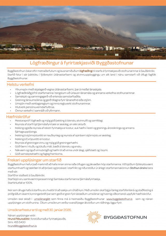 Byggðastofnun óskar eftir metnaðarfullum og lausnamiðuðum lögfræðingi til starfa á fyrirtækjasviði stofnunarinnar á Sauðárkróki.